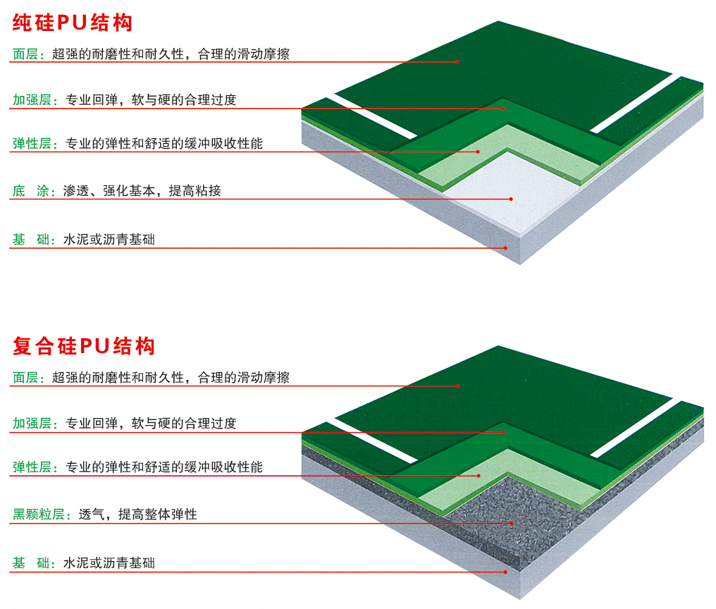 環(huán)保型硅PU系新發(fā)展的環(huán)保球場彈性材料,由德國引進。材料組成為水性有機硅彈性分散液和水性PL液為基礎樹脂,配合骨料、填料、色漿、微細硅纖維及其他添加劑組成。